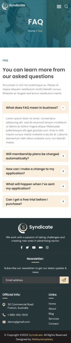 Syndicate business consulting website template Mobile FAQ